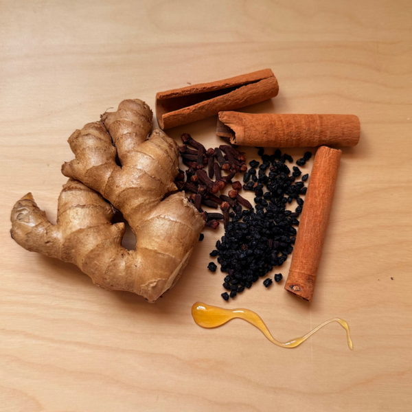 These benefits are amplified with the help of ginger, lemon peel, cinnamon, cloves, mullein leaf (respiratory booster) , and honey.